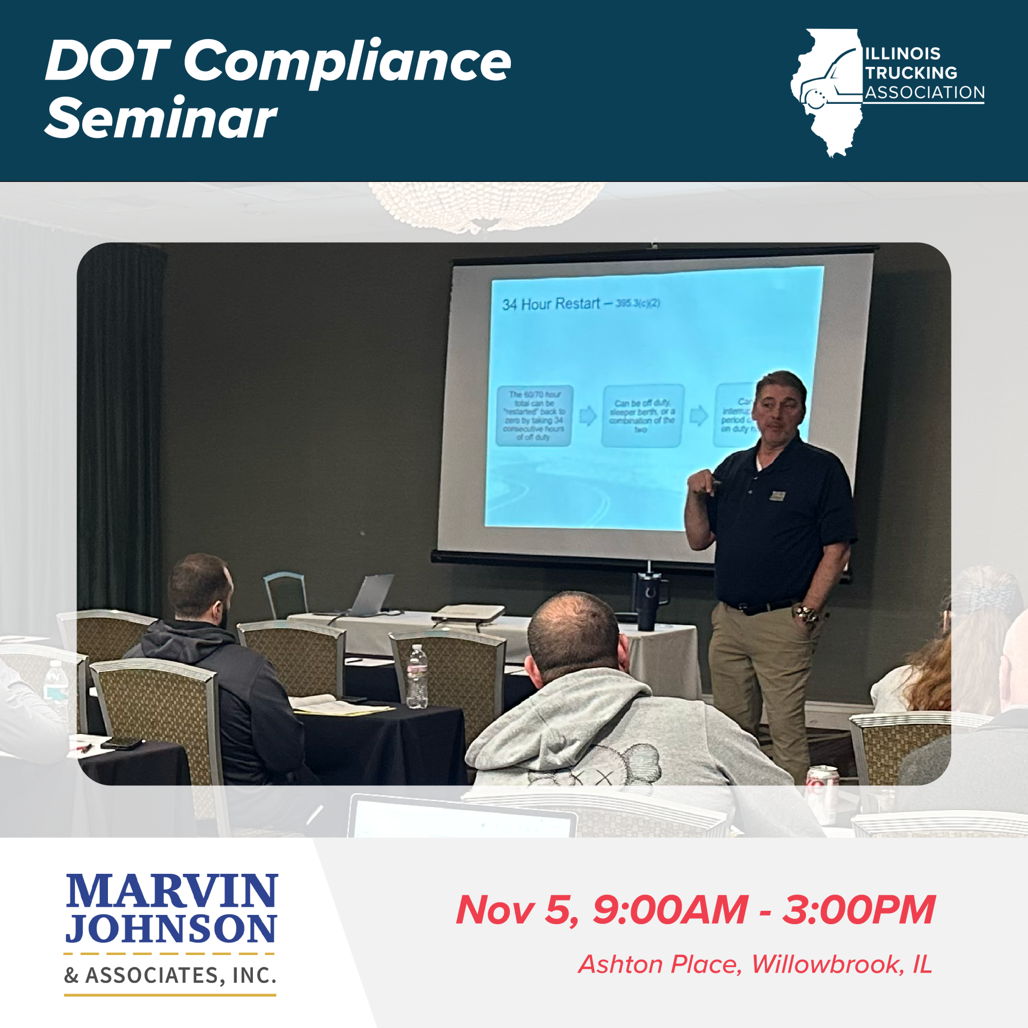 The Illinois Trucking Association and Marvin Johnson & Associates are pleased to present a 1-day seminar that offers detailed training on DOT Compliance. It doesn’t matter if you’re new to trucking or you’re a 30-year veteran of the industry, in to-day’s CSA environment, trucking companies must be equipped with the tools to satisfy the Federal Motor Carrier Safety Regulations.